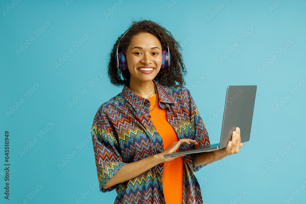 Smiling woman freelancer in headphones working on laptop while standing on blue studio background