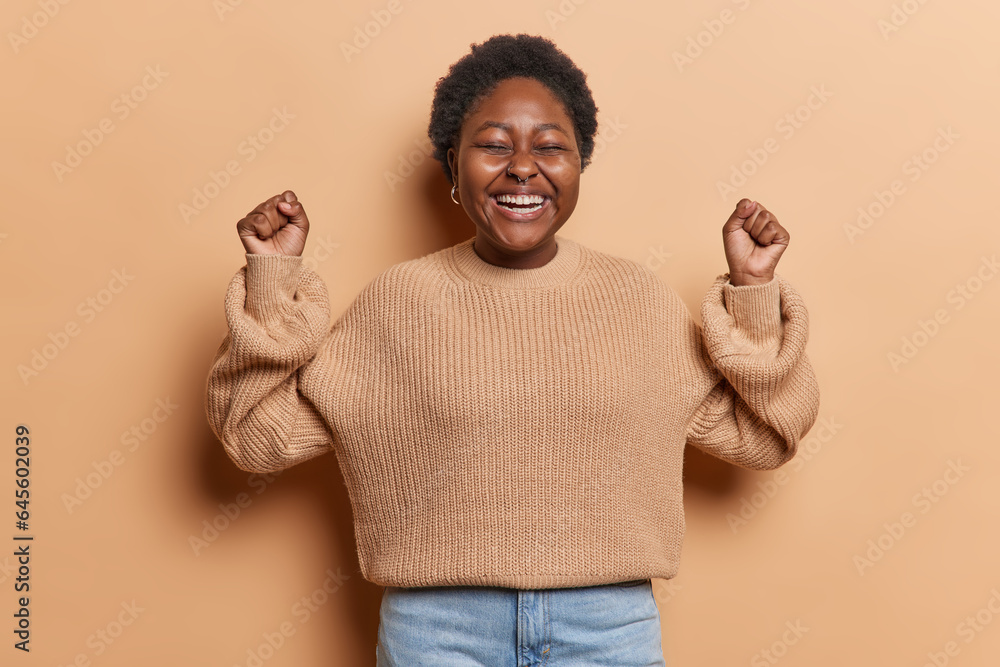 Overjoyed dark skinned plump woman laughs out gladfully clenches fists happily reacts to something with joyful expression smiles broadly wears knitted jumper jeans isolated over brown background
