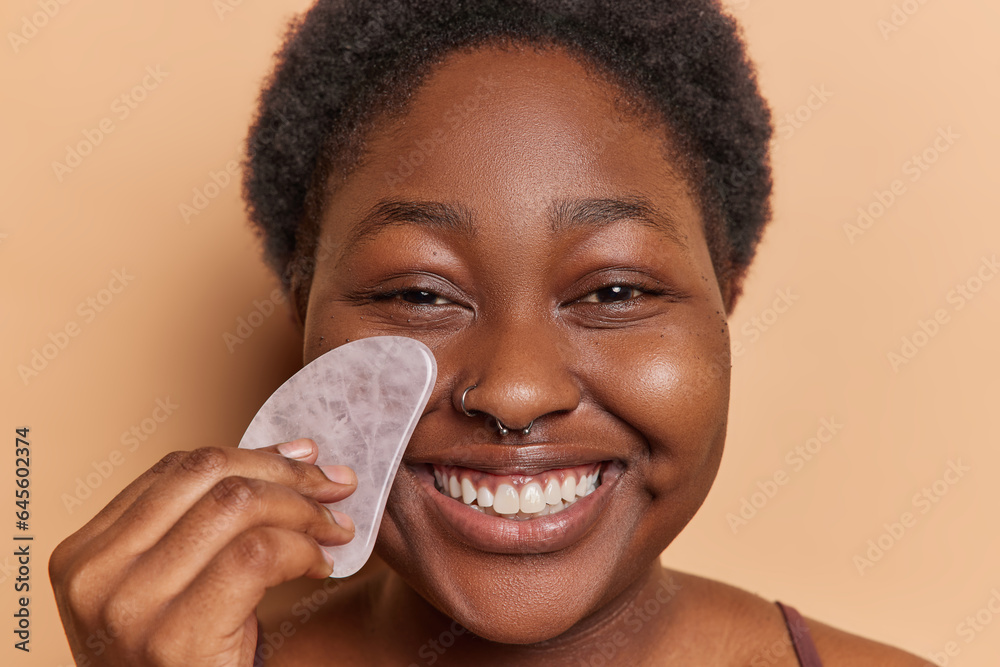 Close up shot of positive dark skinned woman uses gua sha stone for massaging face smiles broadly shows white perfect teeth concentrated at camera isolated over brown background. Beauty and skin care