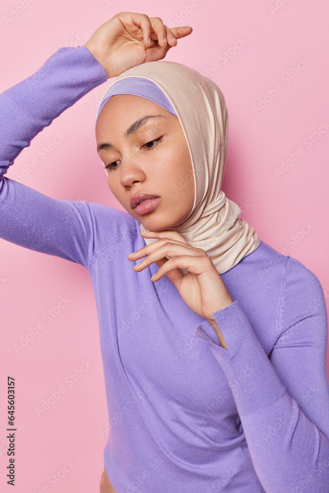 Vertical shot of Muslim woman wears traditional hijab and purple jumper concentrated down touches chin gently isolated over pink background thinks deeply about something. People and religion