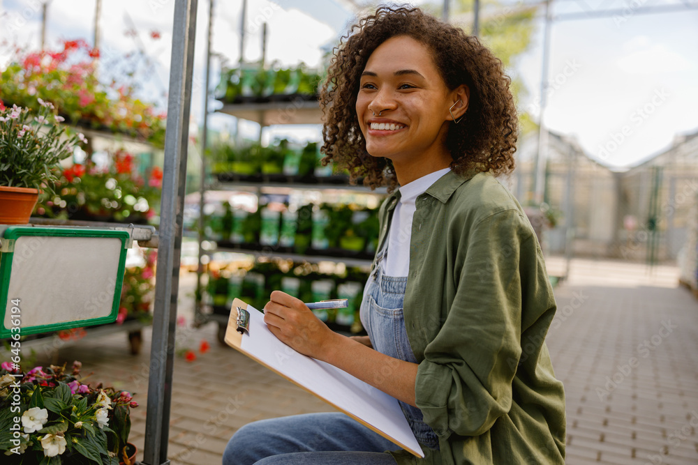 Woman florist writing down plant inventory on clipboard in flower garden center