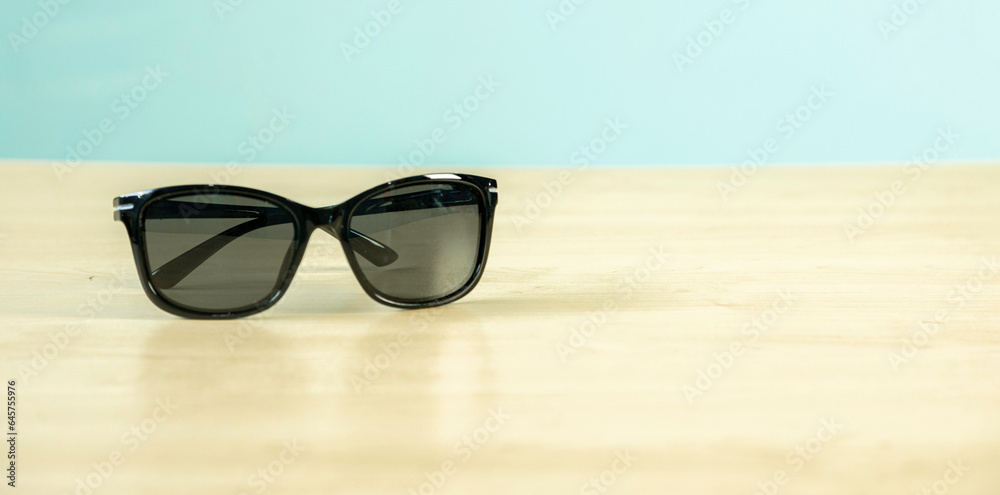 Sunglasses placed on a wooden table