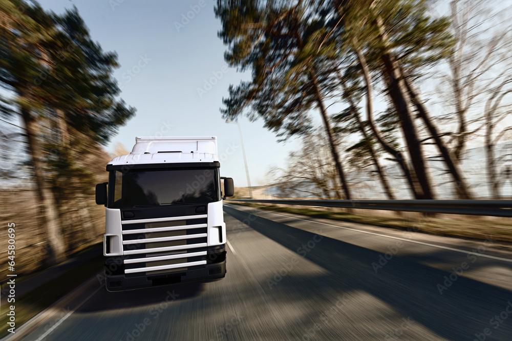 Truck on the road. 3D render on photographic background.