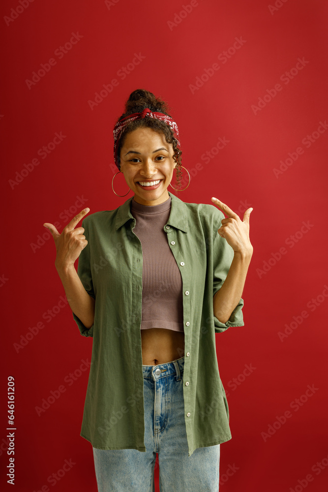 Smiling proud young woman pointing fingers at herself standing over red studio background