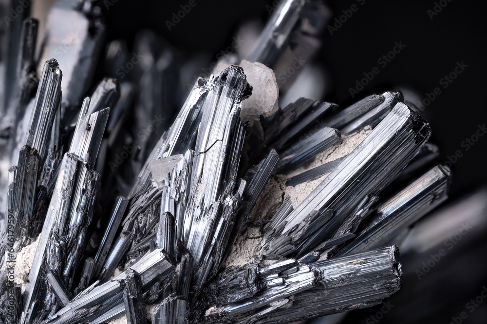 Stibinite crystal. macro detail texture background. close-up raw rough unpolished semi-precious gemstone