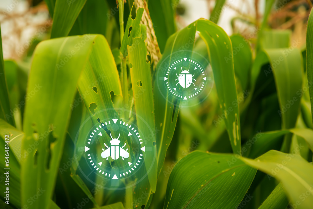 Corn fields perspective with pest and insect, corn plantation field, Growing plants and Agriculture industry concept.