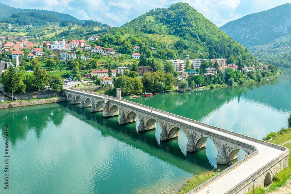 Mehmed Pasa Sokolovic Bridge over Drina river with city panorama, Visegrad, Bosnia