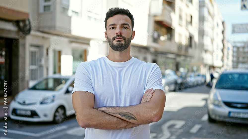 Young hispanic man standing with serious expression and arms crossed gesture at street