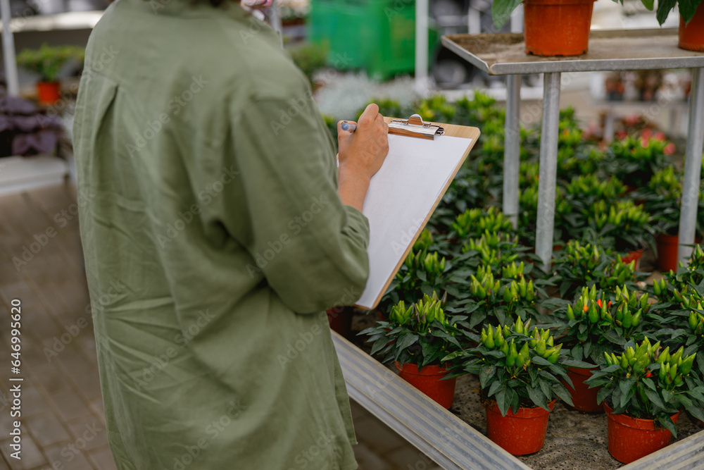 Close up of woman florist with clipboard conducts inventory in flower garden center