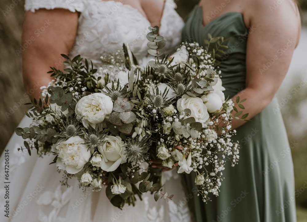 Close up of bouquets in hands of a bride and bridesmaid in green and white