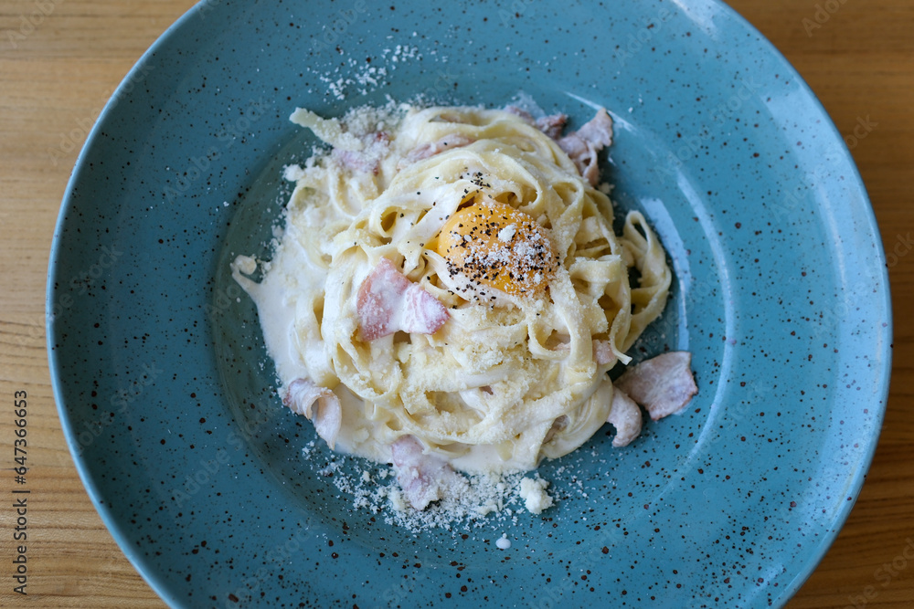 Close up of a fork taking spaghetti with carbonara sauce from a plate. Hot Spaghetti Carbonara on a fork. Italian Cuisine and Home Cooking Concept. High quality 4k footage
