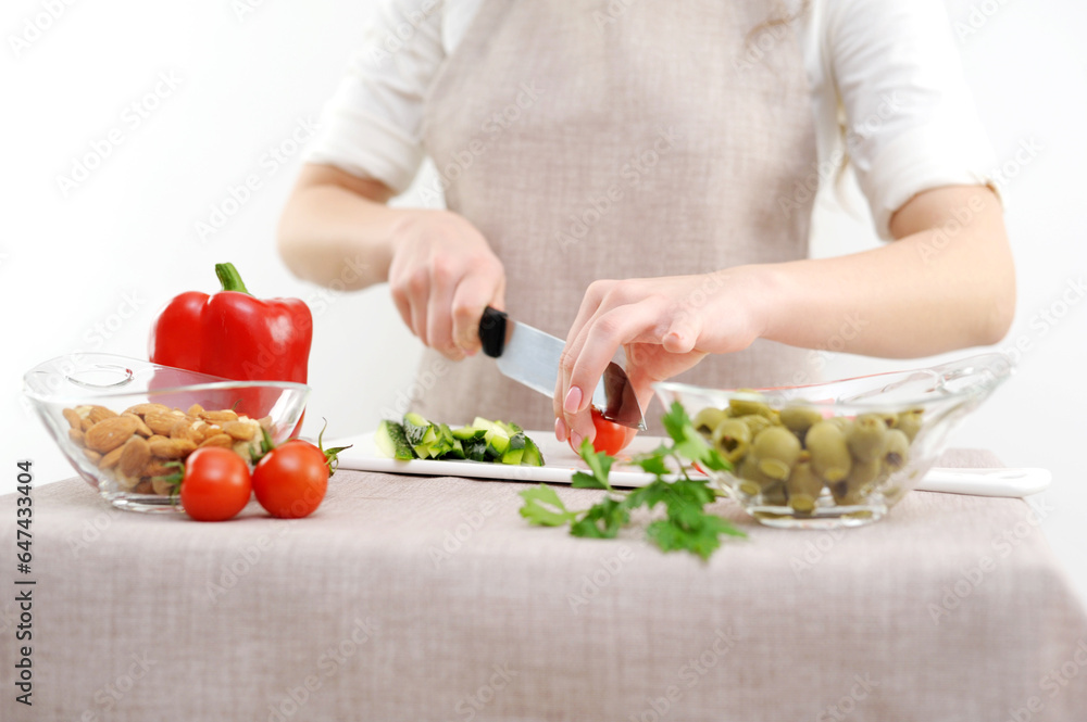 Beautiful young woman preparing vegetable salad in the kitchen. Healthy food. Vegan salad Diet concept. Healthy lifestyle. Cook at home. Prepare food close-up, only hands, olives, tomato, cucumber