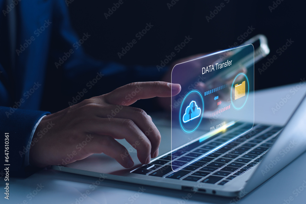 Database management cloud computing and data center security file document transfer concept, Businessman transfer data online security system in business work company. Download and upload data