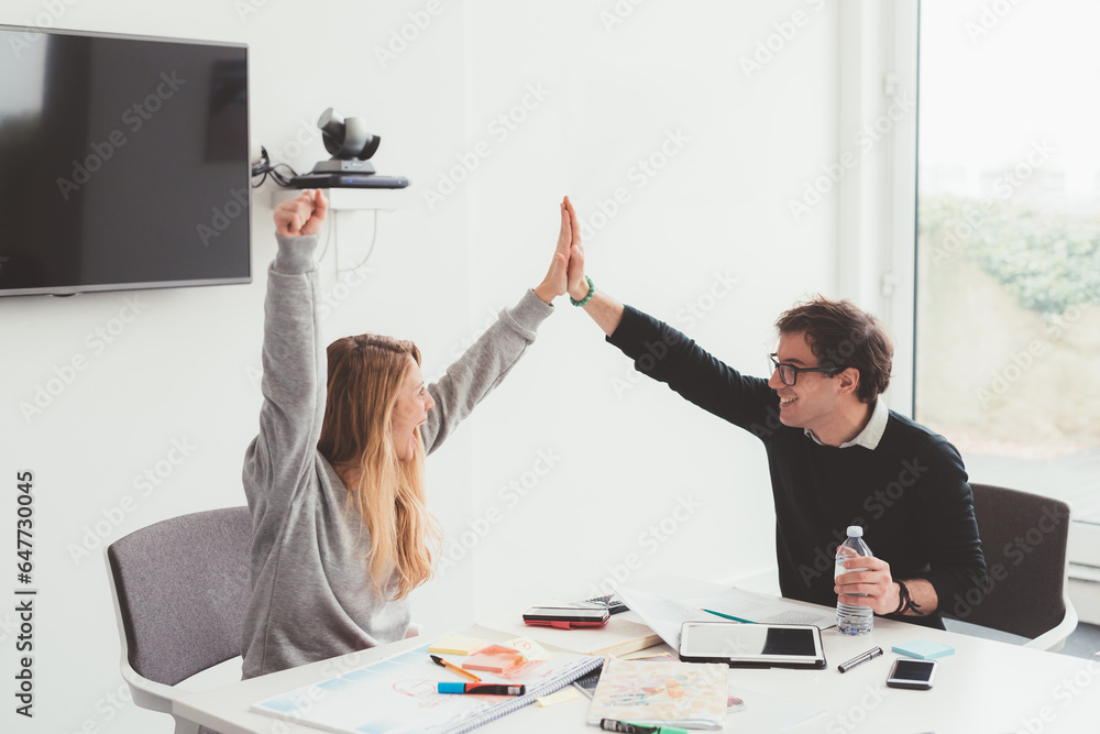 Two millennials business people indoor celebrating success