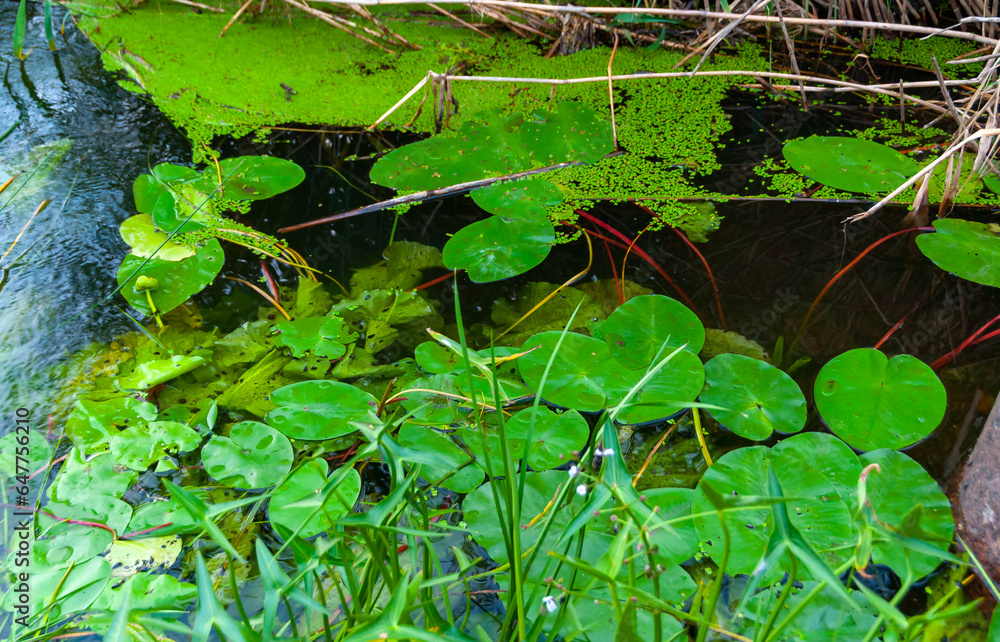 Floating aquatic plants, water lily Nymphaea candida and yellow capsule Nuphar lutea