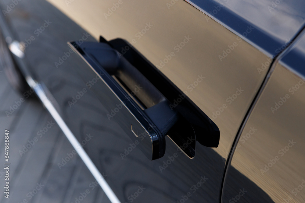 Retractable door car handle. Hidden electric door handle. Car door handles retracting into the body of the vehicle close up