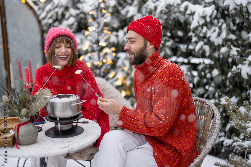 Man and woman have romantic dinner with fondue, while sitting together by the table at beautifully decorated snowy backyard. Young family celebrating winter holidays outdoors