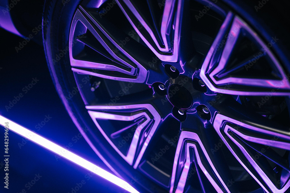 New alloy wheel with neon lighting. Car alloy wheel in pink tones. Modern alloy rim. Car wheel disc
