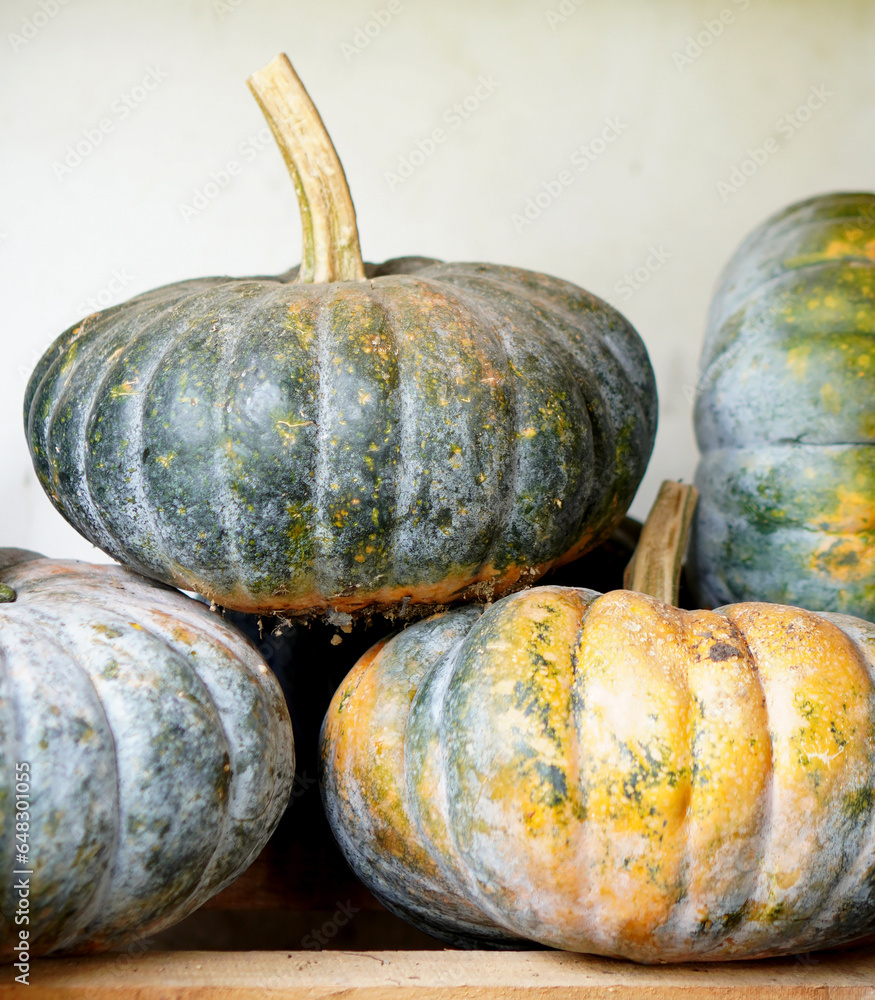Pumpkin on the wooden table. Harvest pumpkins in the garden. The concept of autumn, Halloween, harvest.