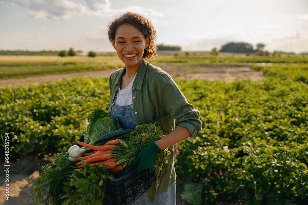 Smiling woman farmer with just harvested vegetables basket ready to sale. Agricultural concept