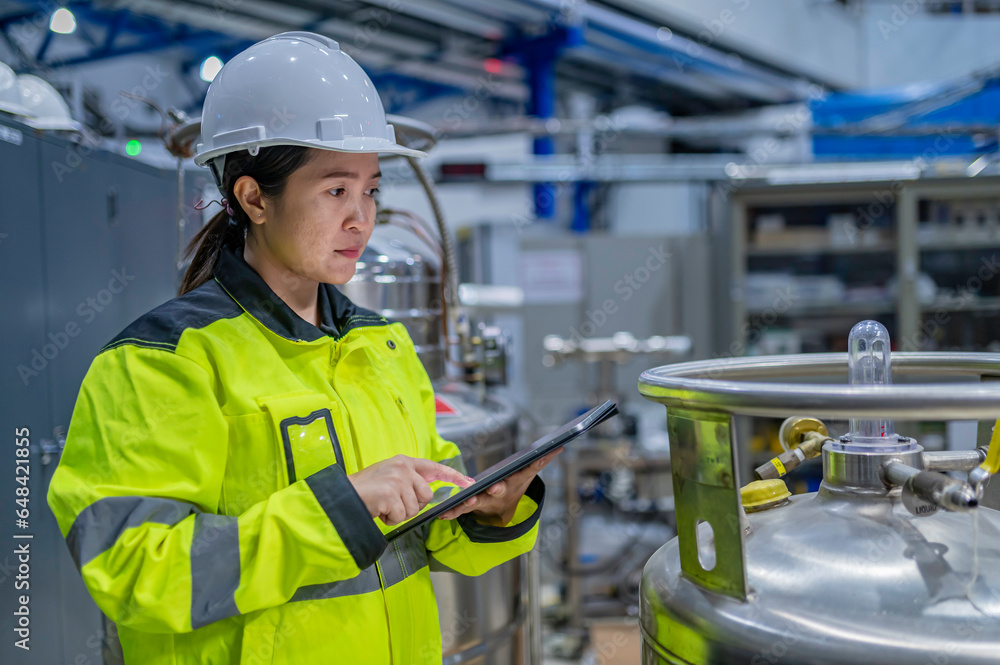 Asian engineer working at Operating hall,Thailand people wear helmet work,He worked with diligence and patience,she checked the valve regulator at the hydrogen tank.