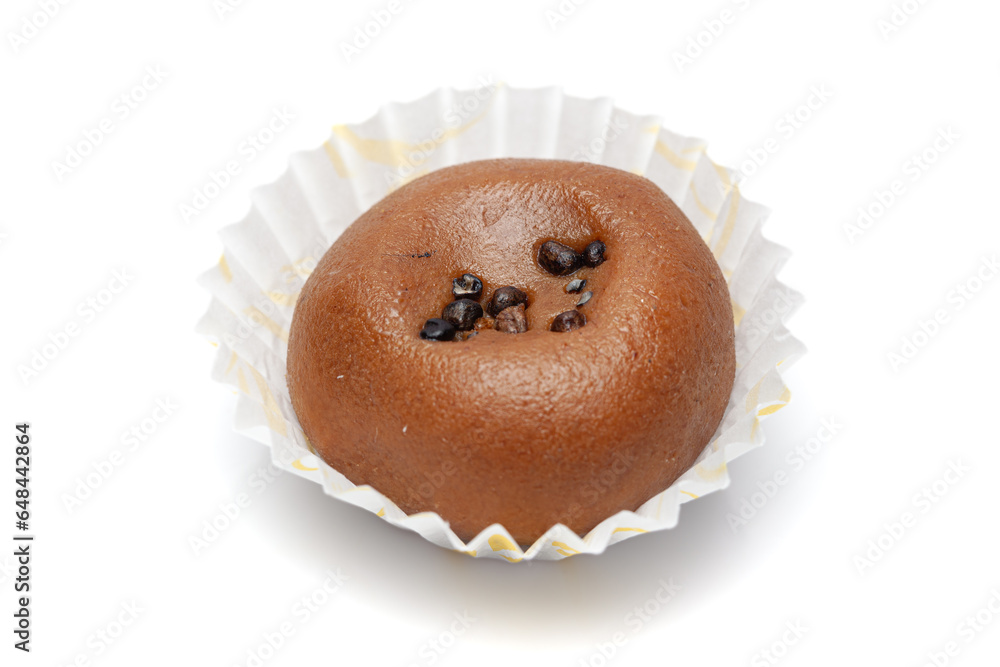 Close-up of an Indian Sweet brown color "khoya peda" garnished with cardamom seeds. Isolated over a white background.