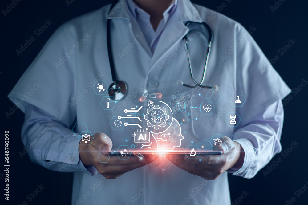 Medical technology, doctor use AI robots for diagnosis, care, and increasing accuracy patient treatment in future. Medical research and development innovation technology to improve patient health.