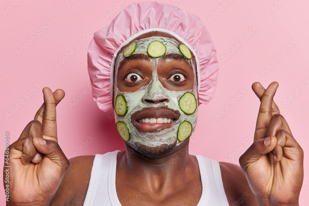 Hopeful young African man makes wish keeps fingers crossed believes in good luck applies facial clay mask with cucumber slices wears bath hat and white t shirt isolated over pink background.