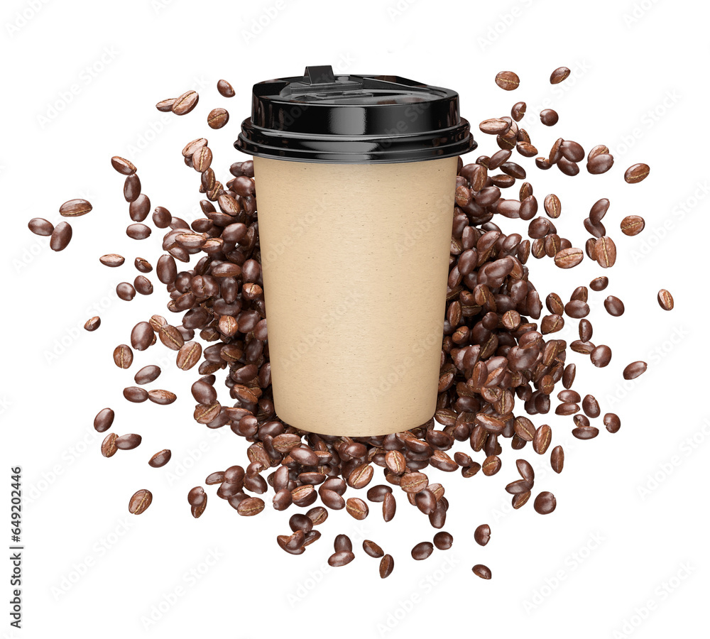 Coffee to go paper cup on the coffee beans splatter background. Takeaway drink with plastic cap and natural aroma Beans. Morning espresso or americano beverage packaging, isolated. 3D PNG illustration