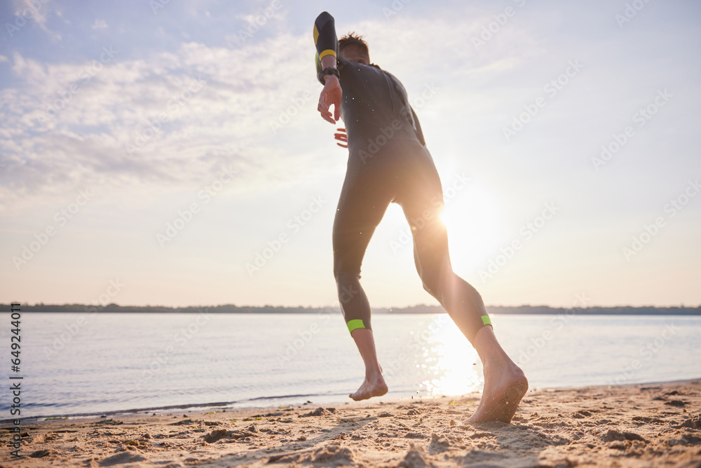 Sportive man in wetsuit running on beach into water for early morning training. Swimming, triathlete workout. Concept of professional sport, triathlon preparation, competition, athleticism