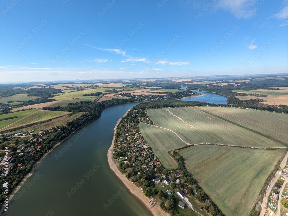 The Hracholusky concrete dam with water power plant.water reservoir on the river Mze. Source of renewable energy and popular recreational area in Bohemia. Czech Republic, Europe.aerial, green water