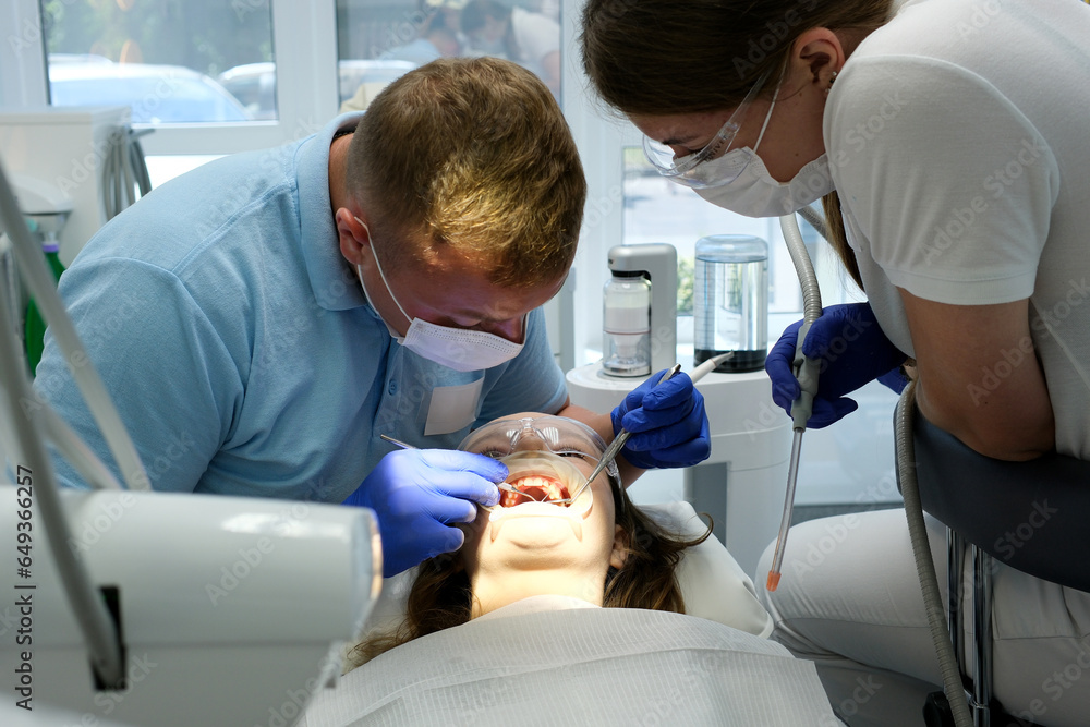 latest technology cleaning and whitening teeth nurse and doctor treating the teeth of a young female patient teenager masks gloves cleanliness sanitation. latest device in dental office in a clinic