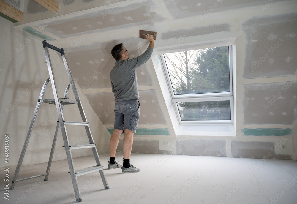 Man plastering drywall in a private house.