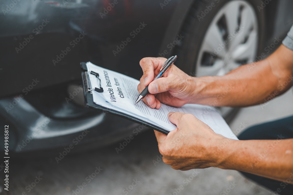 male insurance officer came to help inspect a customer's car that had an accident. Concept for vehicle crash, insurance claim.