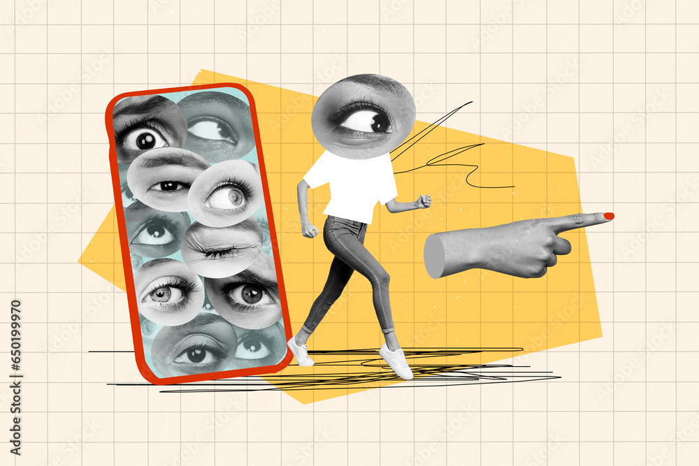 Billboard collage of funny headless absurd surreal eye watching propaganda direct finger smartphone community isolated on plaid background