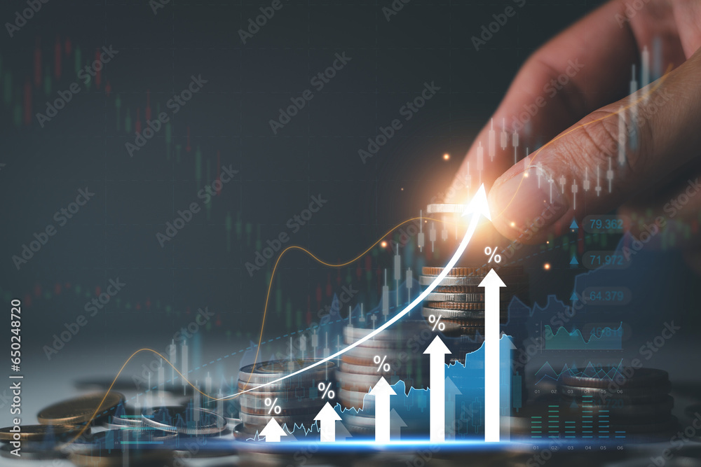 Interest rate and dividend concept. Businessman with percentage symbol and up arrow, Interest rates continue to increase, return on stocks and mutual funds, long term investment for retirement.
