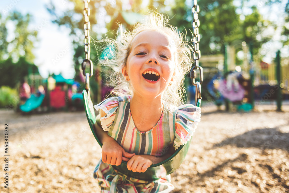Happy 3 years old girl on a swing. Happy kid on playground