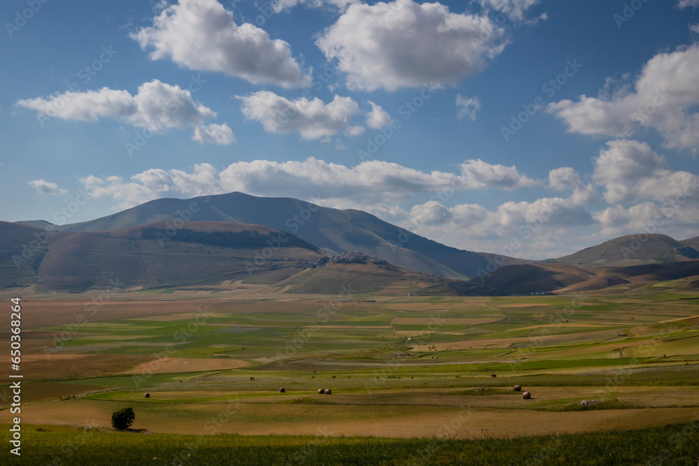 Famous mountain village of Castelluccio di Norcia with beautiful summer landscape at Piano Grande (Great Plain) mountain plateau in the Apennine Mountains on a cloudy day, Umbria, Italy. Low key.