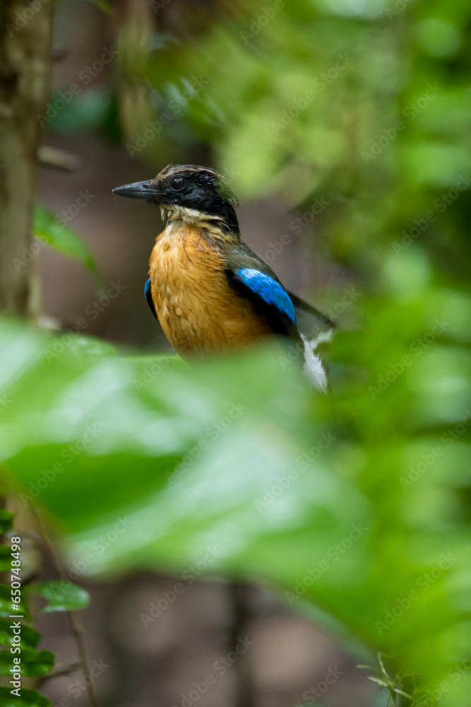 Has a black head over the eyes, wide brown stripes Green top body The feathers covering the wings of the rump and the top of the tail are bright blue.