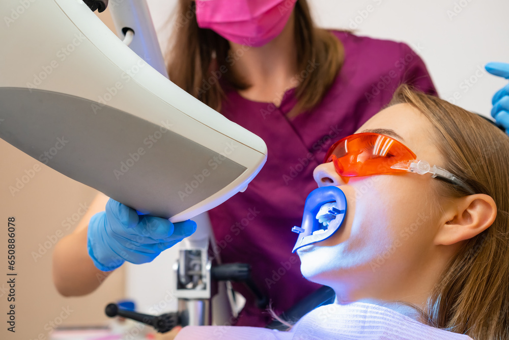 Teeth whitening for woman and application of laser bleaching teeth at dentist clinic