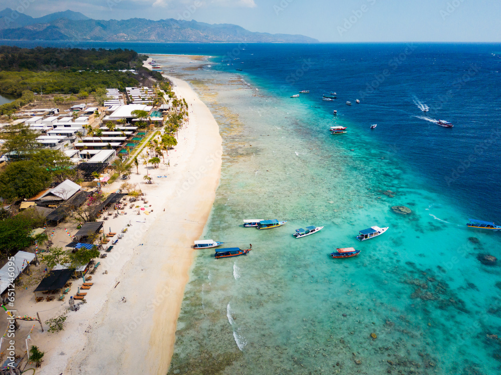 beautiful tropical ocean view of Gili Island, Gili Air, aerial landscape by drone in Lombok, Bali, Indonesia