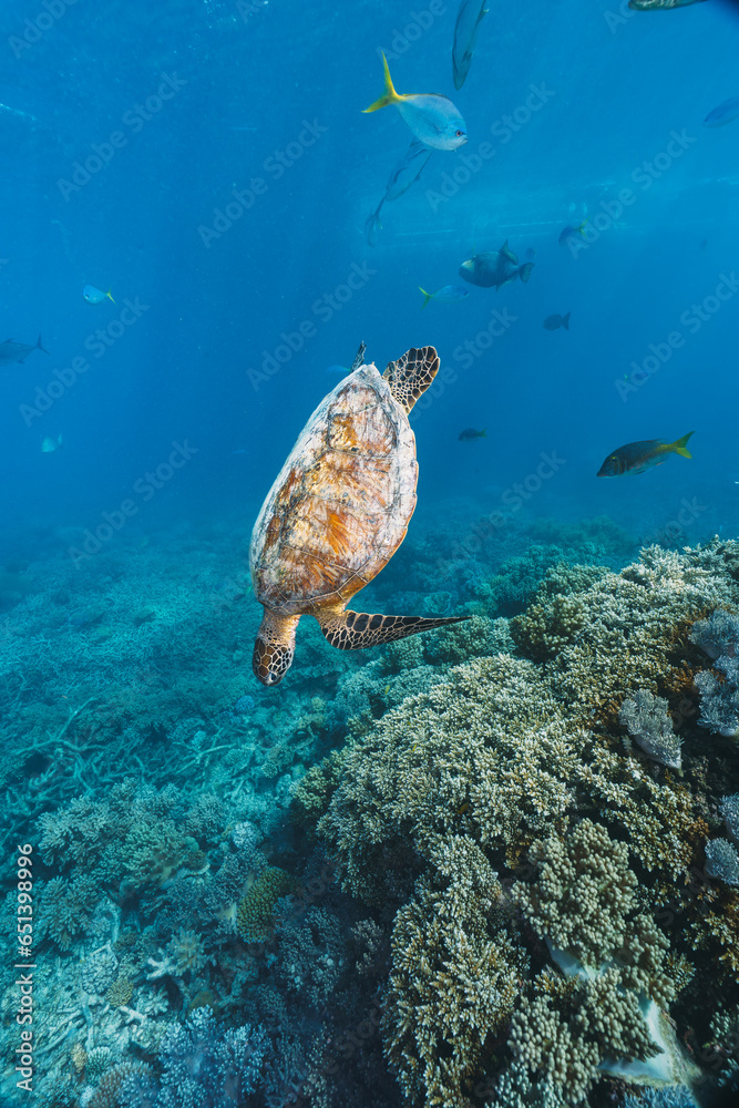green sea turtle pose close to the healthy coral reef in australia