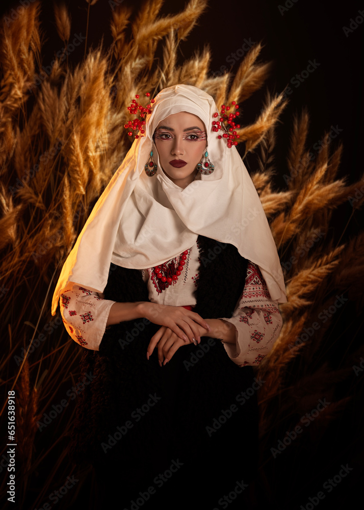 Woman as motanka . Traditional costume. Symbolism, ancient magic, force of nature, cosplay