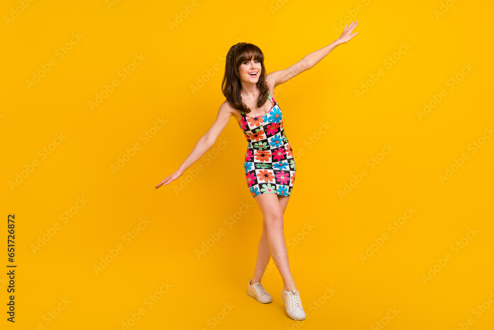 Full length photo of funky sweet lady wear flower print clothes dancing flying arms sides isolated yellow color background