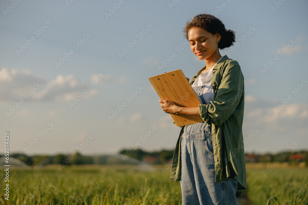 Female agronomist making notes on clipboard standing on field . Agricultural occupation concept
