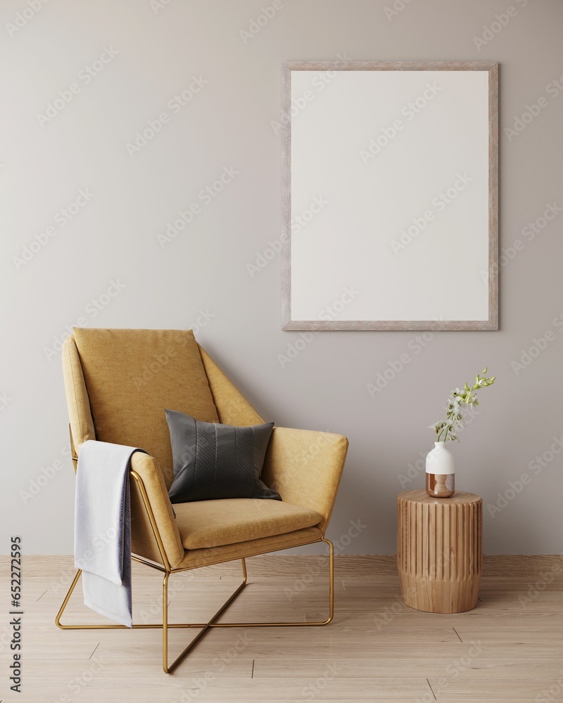 Yellow armchair in a grey room with a picture frame adjacent to it, providing a copy space