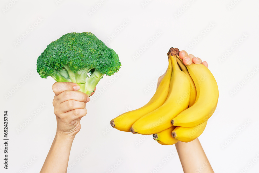 A bunch of ripe bananas and broccoli in young woman's hands isolated on a white background. Diet, weight loss and wellness, vegan nutrition. Fruits and vegetables. Healthy lifestyle