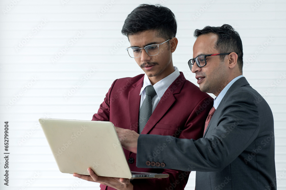 Senior manager pointed out the highlights of a new project the young Indian brought to discuss, young businessman holding laptop computer, cooperation concept