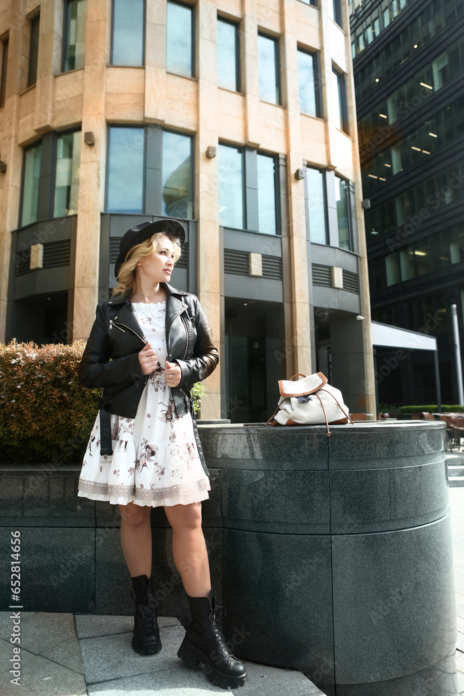 blond woman in black leather jacket, military boots, black hat full body photo on city urban downtown background
