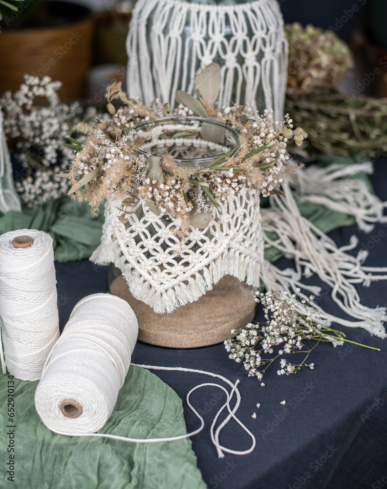 Makramee mit Trockenblumen, Windlicht, Dekoration, macrame
